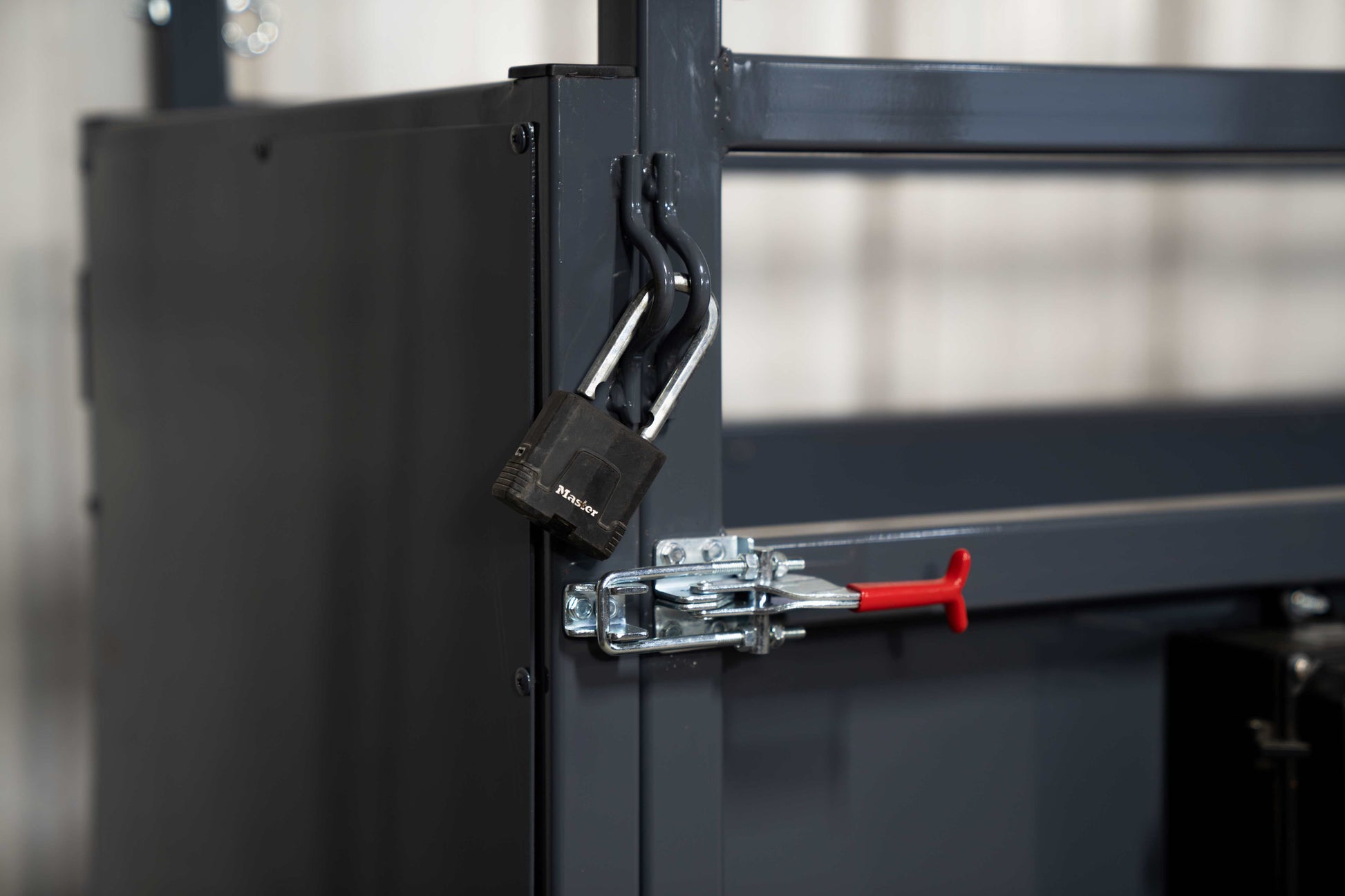 Latches on both doors accommodate padlocks, proving full control of who uses the treadmill